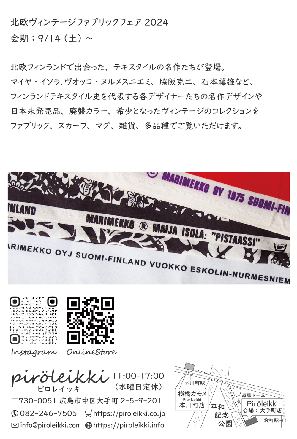 ピロレイッキ 大手町店の9月のイベントは、北欧フィンランドテキスタイルデザインをアートのように大判で楽しめるヴィンテージファブリックの展示販売会を開催いたします。