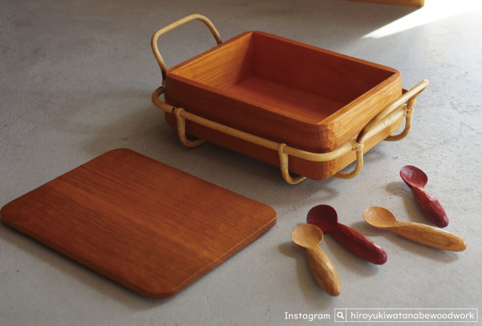 籐ハンドルと蓋付きの木箱や、ウレタン塗装の器など新作も多数登場します。