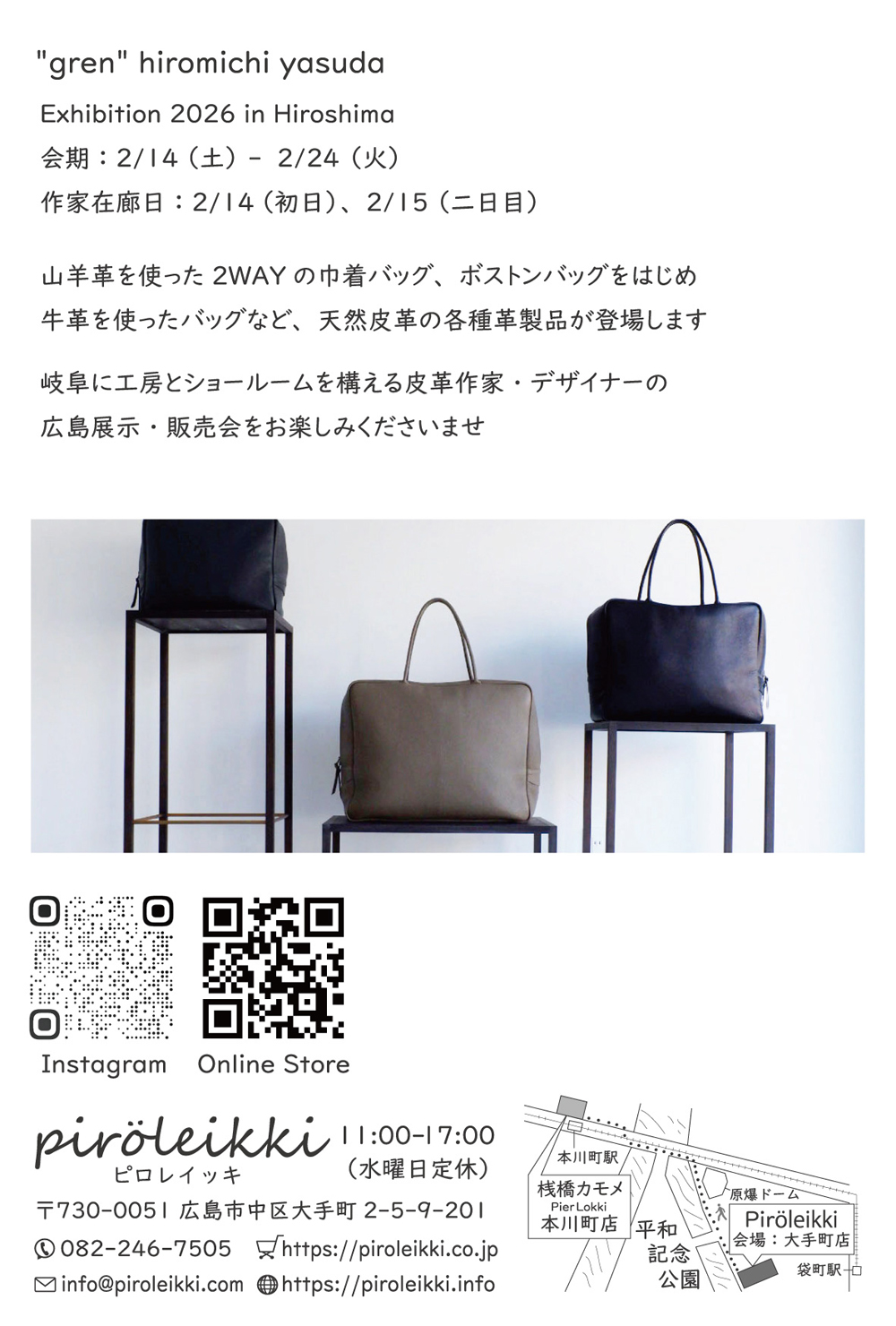 ピロレイッキ 大手町店では、2/14(土)より、岐阜県岐阜市に工房とショールームを構える皮革作家・デザイナー「”gren” hiromichi yasuda」さんの作品展示・販売会を開催致します。