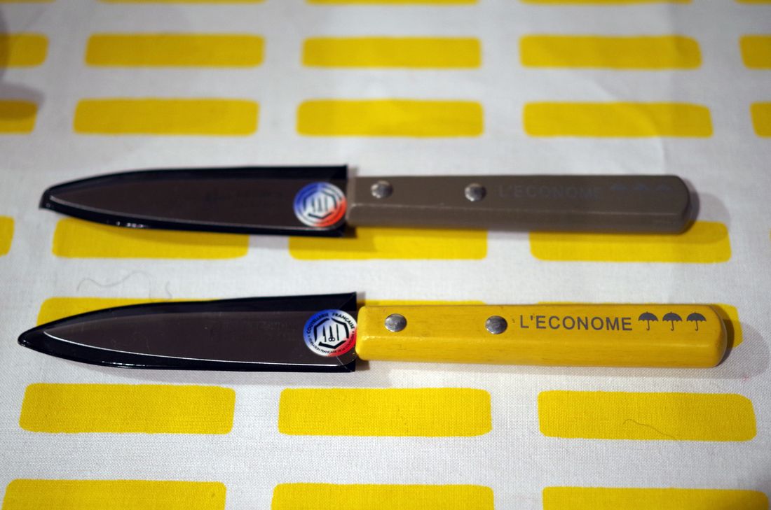 柄のビビットな色使いと、並んだ傘マークが可愛らしい、レコノムのぺティナイフ。
