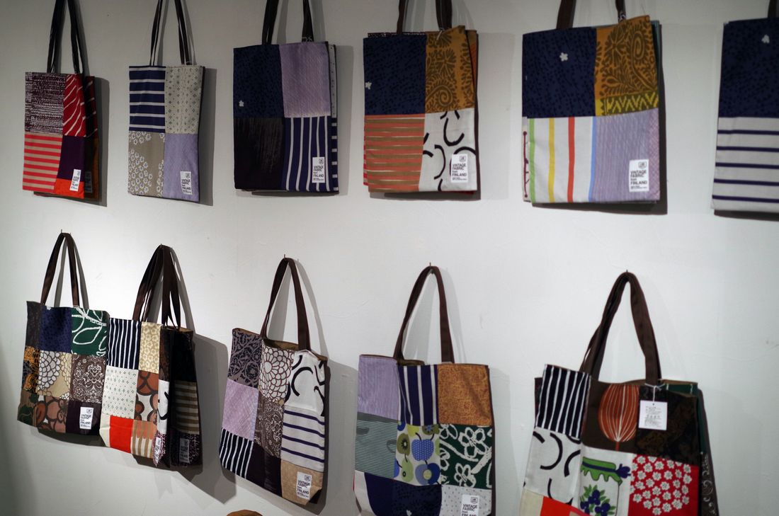 マリメッコの廃盤デザインの生地など、フィンランドのヴィンテージファブリックを加工したバッグや、クッションカバーを入荷しております。