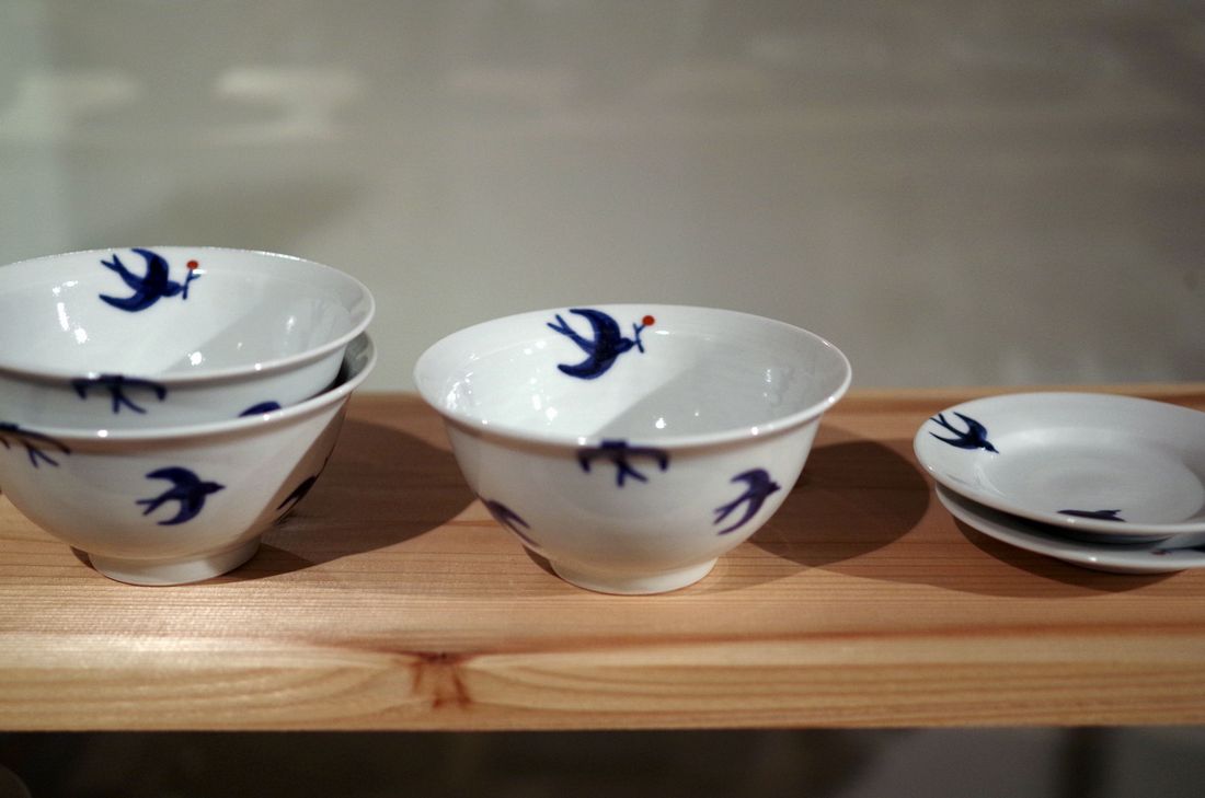 日下華子さんの「つばめ」をモチーフにした本作品は、透きとおる白い器を背景に、燕が内外に自由に舞う躍動感のある絵付け。