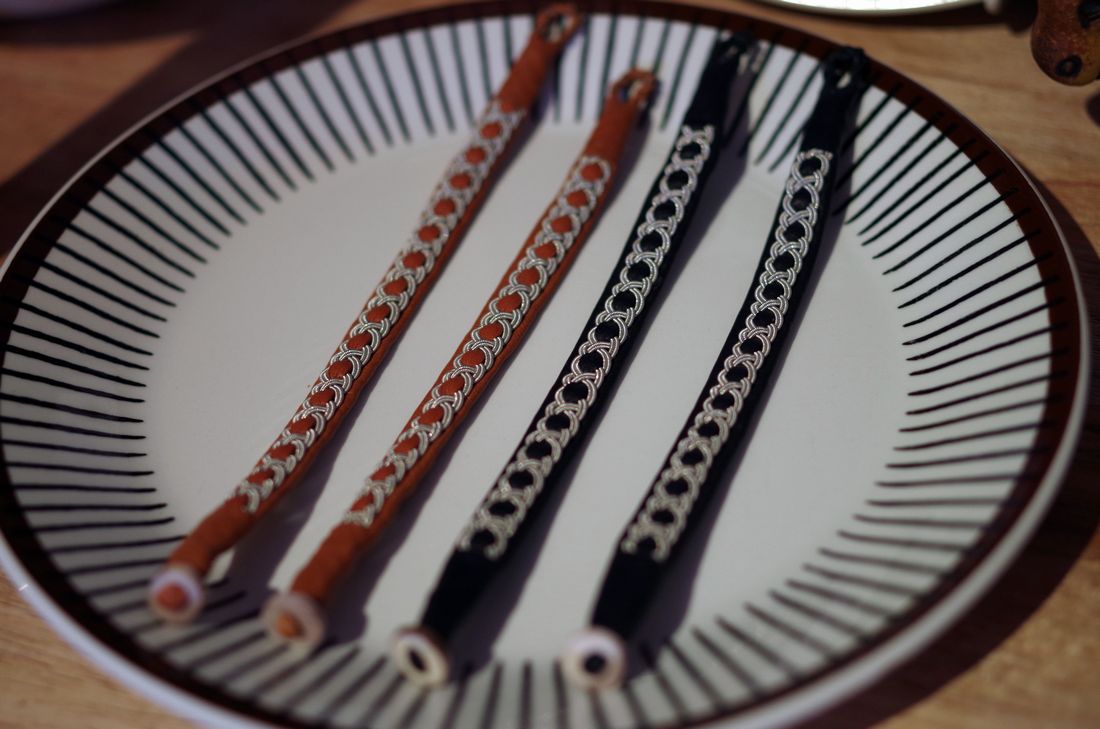 トナカイの皮に、ワイヤー状のピューター(錫の合金)を編み込んだブレスレット。