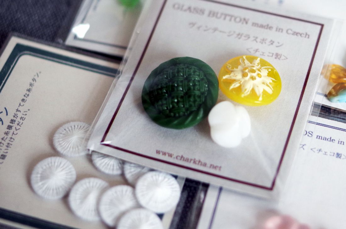 独特な輝きと緻密なデザインが特徴的なヴィンテージガラスボタンに、クルクルと巻きつけた糸模様の素敵な糸ボタン。