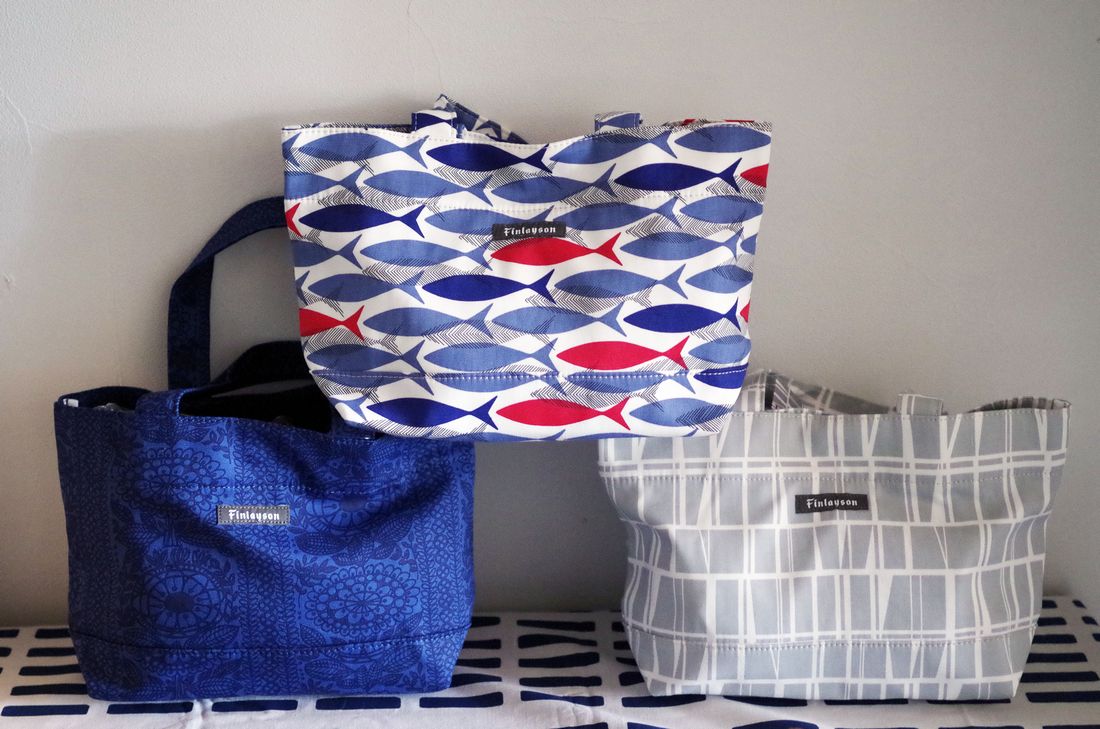 フィンランドのホームテキスタイル代表格「Finlayson(フィンレイソン)」のデザインが施された、日本のファブリックブランド「かまわぬ」生産のコラボバッグ。