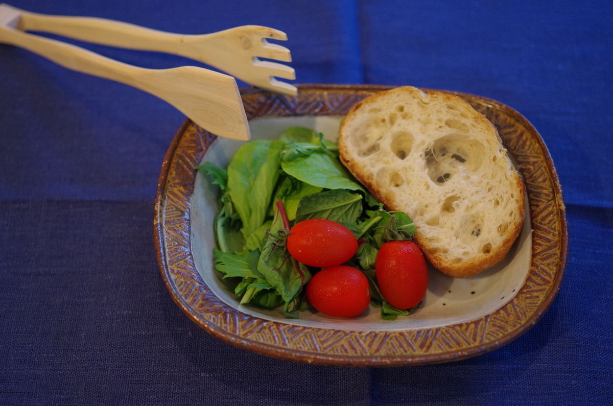 今朝は羅以音窯(らいおんがま)の器にサラダを乗せて。落ち着いた色味の器に、緑が映えます。江口香澄さん作の長方形の器は新作です。