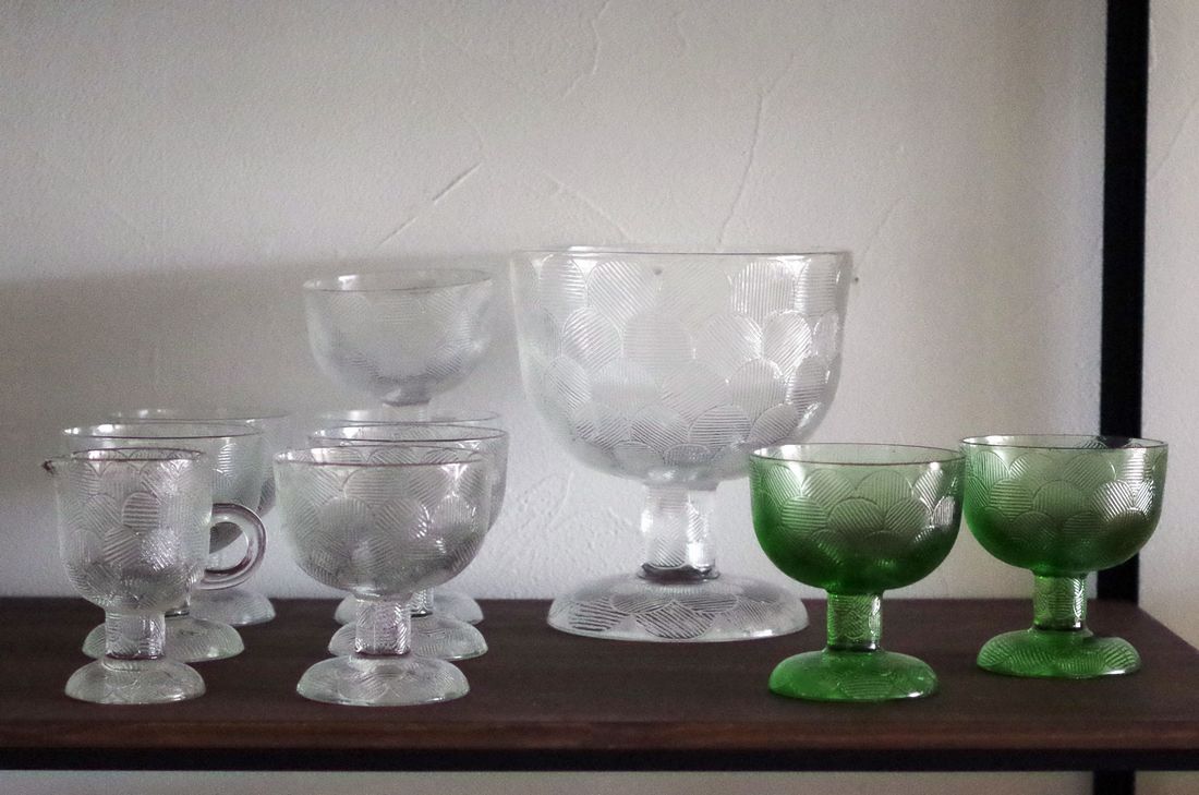 デザートボウルのクリア/グリーン、クリーマー、大サイズのボウルと、今回の買付けでたくさん出会えました。