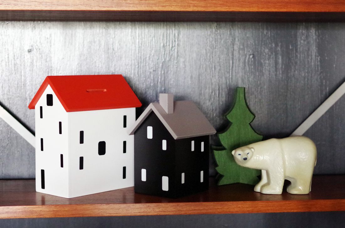 北欧のちょっと田舎の方に行くと見かける家の形を模した、可愛らしい貯金箱は、クリスマスっぽい風景をお部屋の中に表現するのにも適したオブジェ。