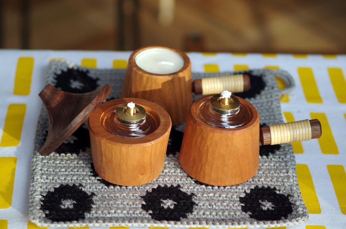 オイルランプホルダーとキャンドルホルダーも、木製だと味わい深い。