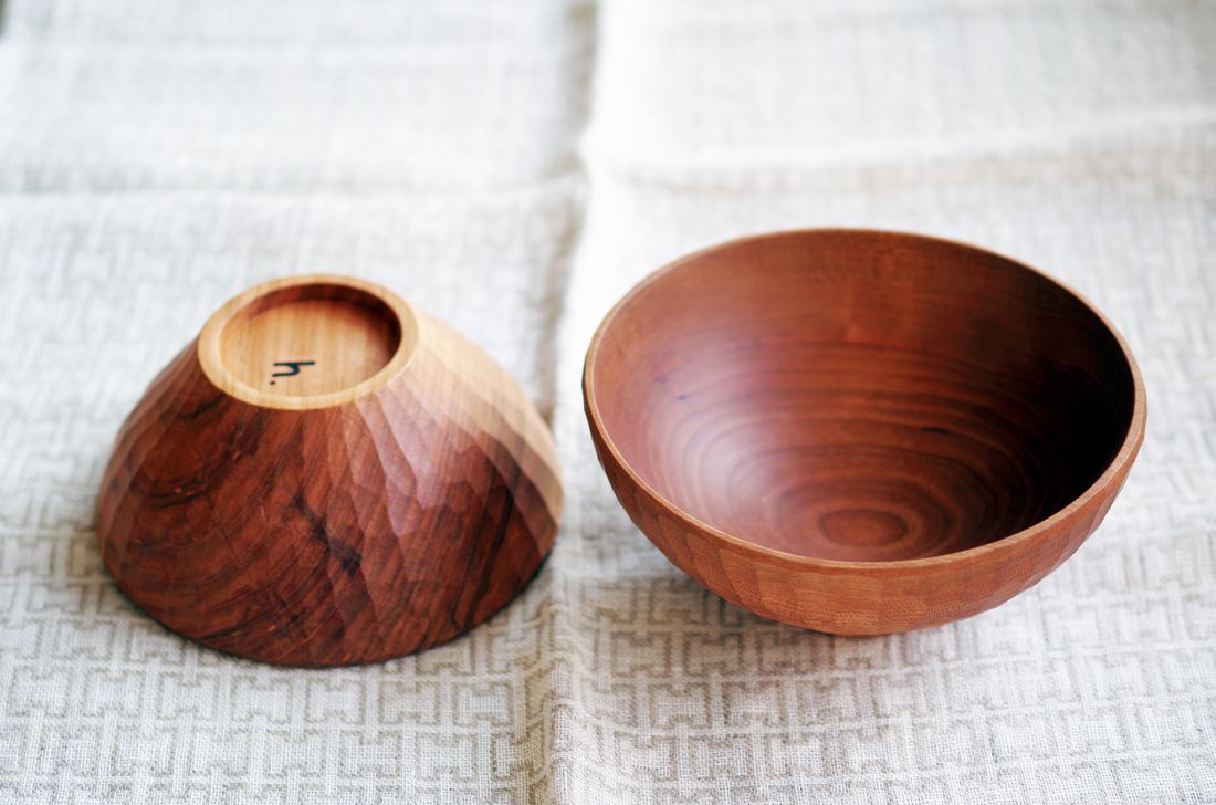 内側は木目を立体的に楽しむことができ、外側は彫りによる独特な味わいを楽しめる、独創性の高い作品です。