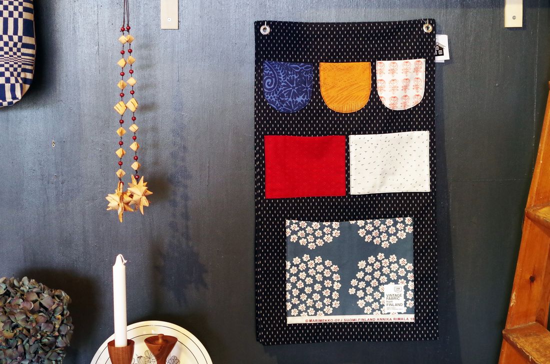 日本の伝統的なファブリック「久留米絣」に、「マリメッコ」などのフィンランドのヴィンテージファブリックを合わせたウォールポケット。