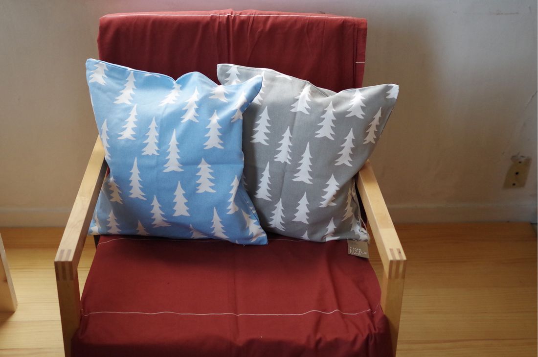 Fine Little Day のテキスタイルパターン「GRAN」の新色、ライトブルーとグレーのクッションカバーが入荷しました。