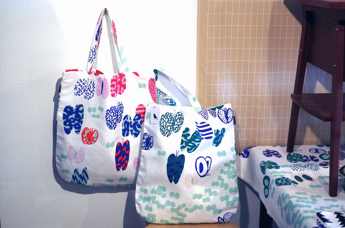 kauniste(カウニステ)の新柄「Perhonen(ペルホネン)」は、名前の通り大小色柄とりどりの、多彩なたくさんのちょうちょが羽ばたくデザイン。