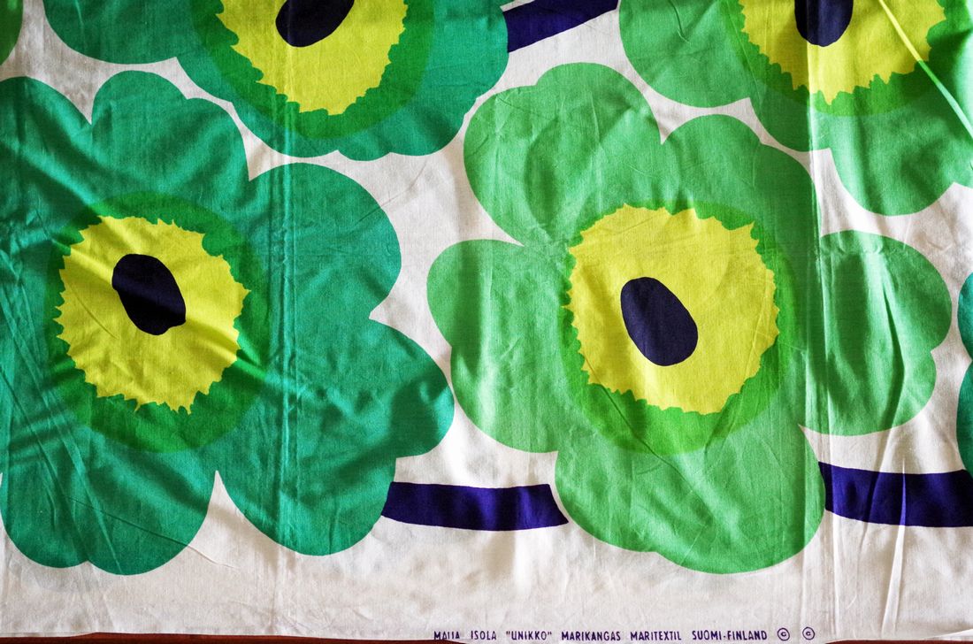 マリメッコ黎明期の当時の貴重な資料的な価値もありながらも、現役でお使いいただける、緑の発色鮮やかなウニッコ柄のファブリックです。