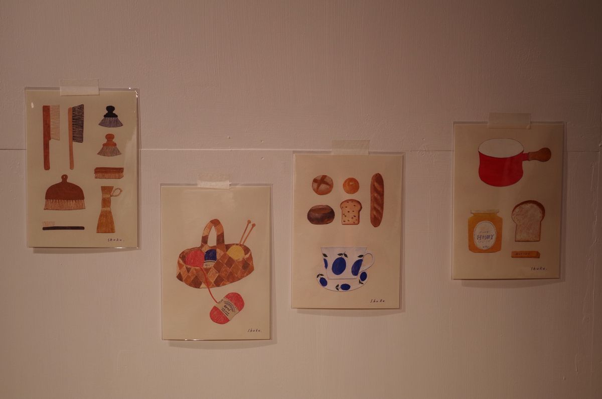 ブラシ、毛糸、白樺のカゴ、アラビアの食器、バターウォーマー、パンやはちみつをモチーフに。
