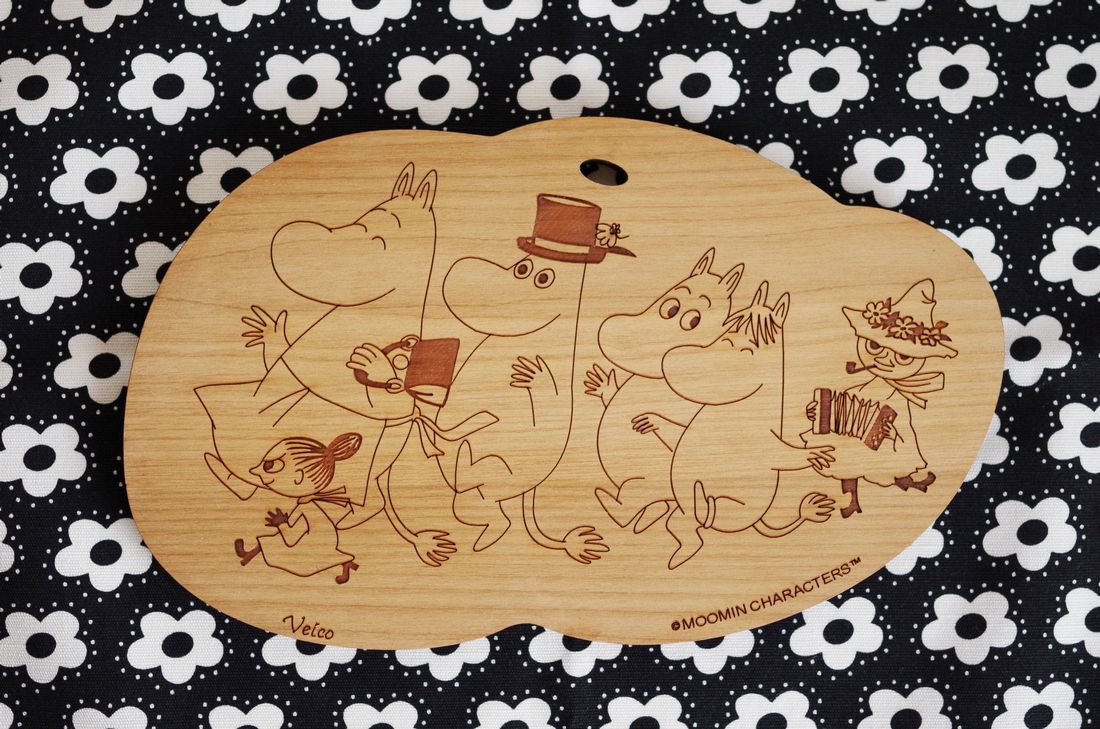 ムーミンたちがスナフキンの演奏に合わせて笑顔でスキップしている様子が楽しい、フィンランドの白樺を使ったポットホルダー。