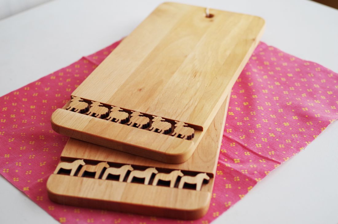 Skandinavisk hemslojd(スカンジナビスク・ヘムスロイド)の、羊とダーラナホースの立体的な装飾が特徴的なカッティングボード。