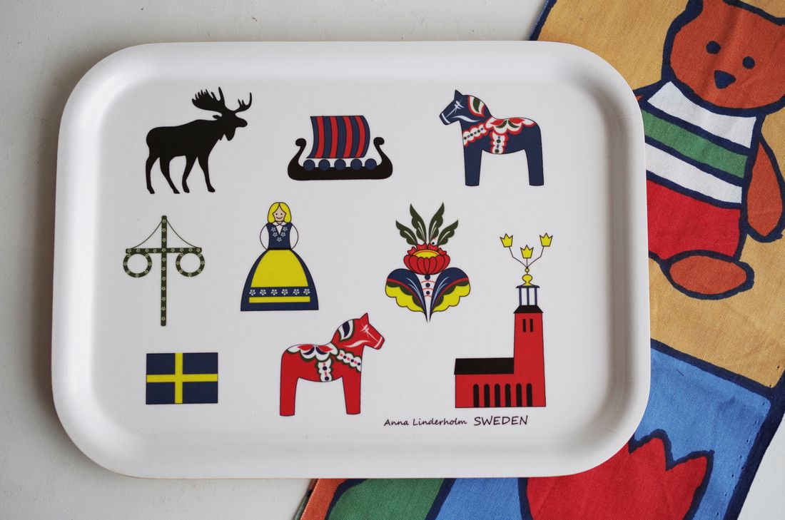 ダーラナヘスト、ヘラジカ、ヴァイキング船、クロス、民族衣装、ガムラスタンなど、スウェーデンの名物を全部のせしたようなデザインのトレイ。