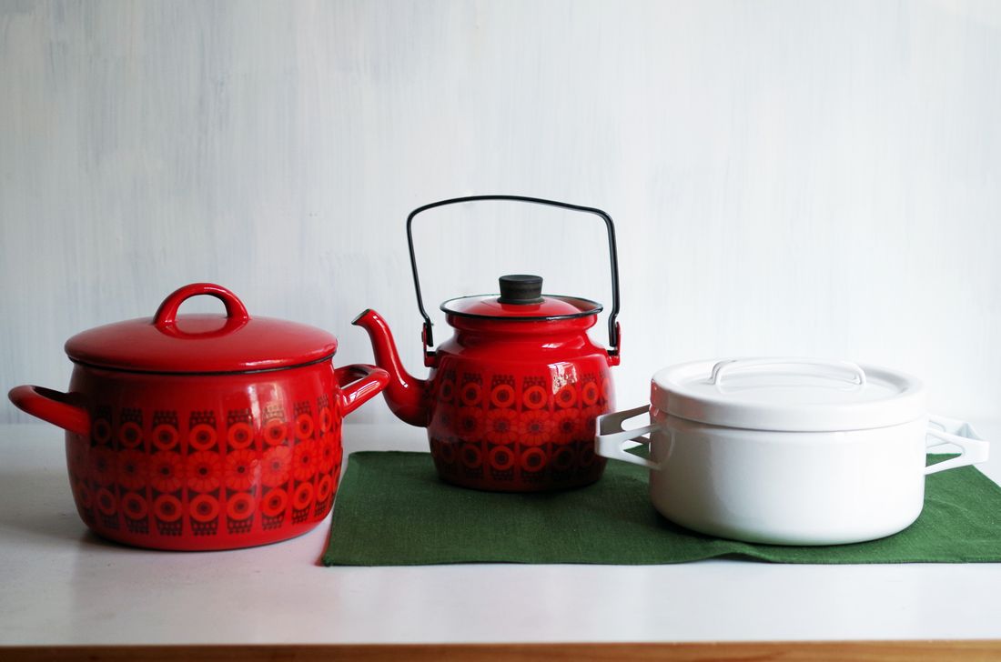 レッドやホワイトの大小の両手鍋や、Arabiaで活躍したデコレートデザイナーRaija Uosikkinen(ライヤ・ウオシッキネン)が手掛けた、花柄のKehraシリーズの両手鍋やポット。