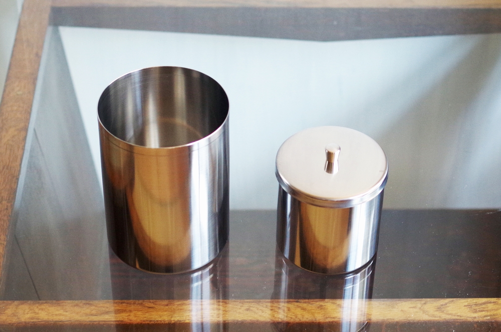 フタ付きジャーは、元々医療用の包帯ケースですが、包帯入れや綿棒入れとしてはもちろん、塩や砂糖などの調味料入れとして、小物入れとしても活躍します。