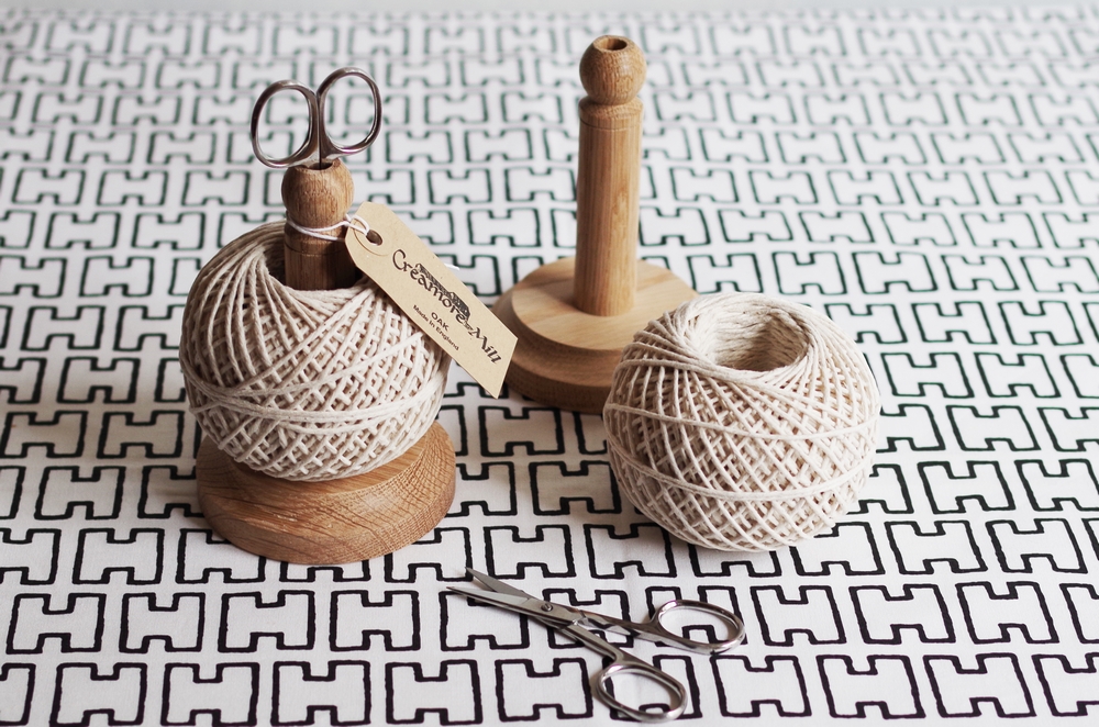 天然のオーク材の木目や風合いが美しいスタンドには、ハサミを収納できる機能性も備え、付属のリフィル以外にも、自分でお気に入りの糸をボールにして使ってみてもとっても便利な面白い作品。