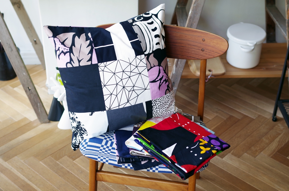 マリメッコのヴィンテージファブリックを使った、パッチワークのクッションカバー。