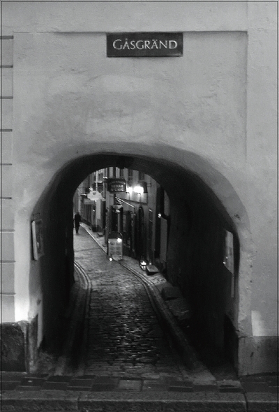 2.ストックホルム、旧市街ガムラスタン。雨の小道