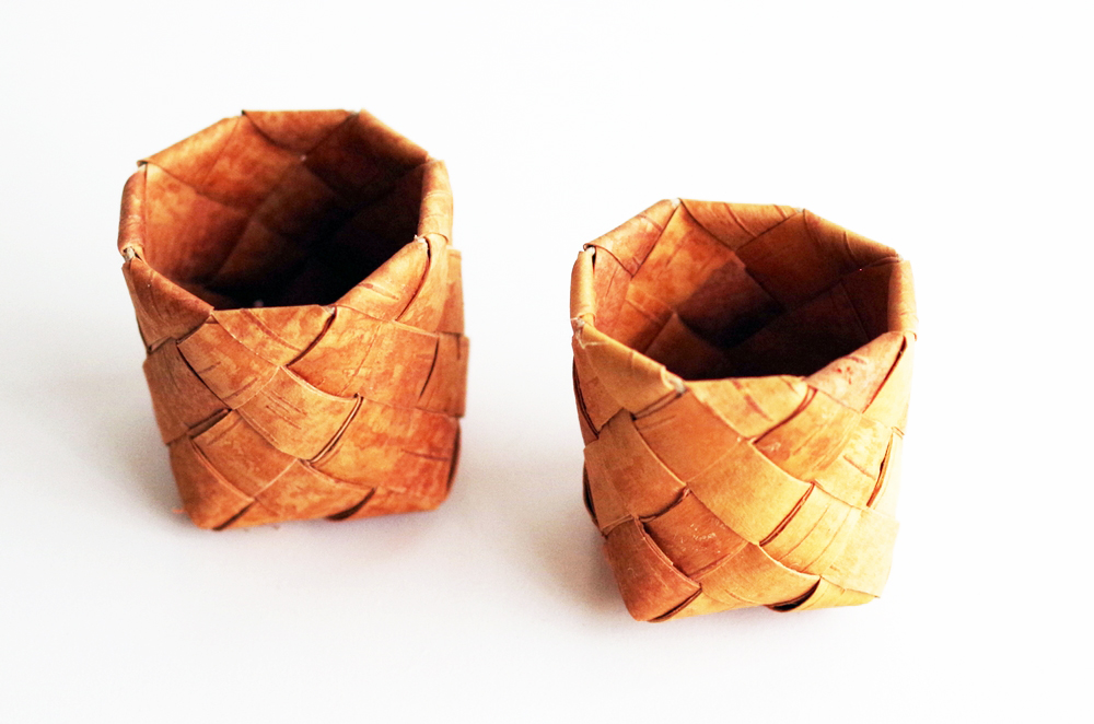 お猪口サイズの白樺バスケットは、単品でも装飾として十分な存在感を放つ。