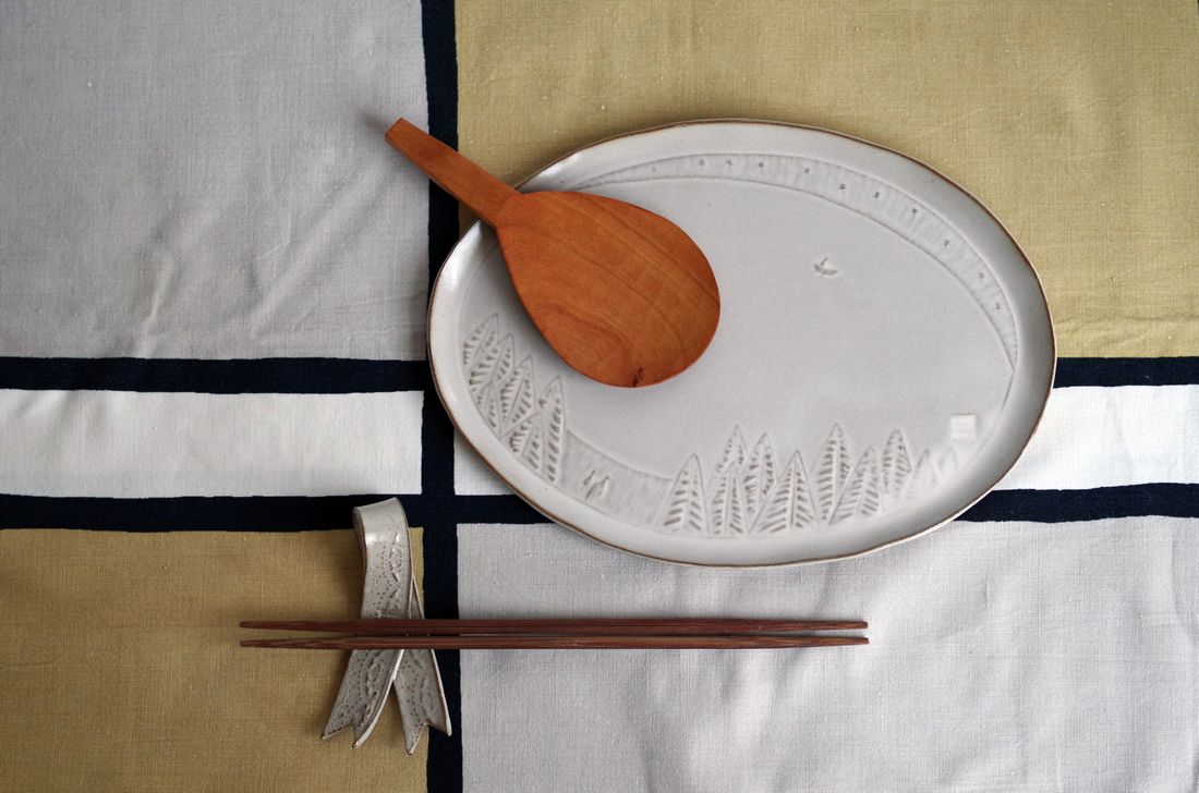 森の湖の皿と、リボンの箸置き。 湖畔の森から覗く鹿の親子…